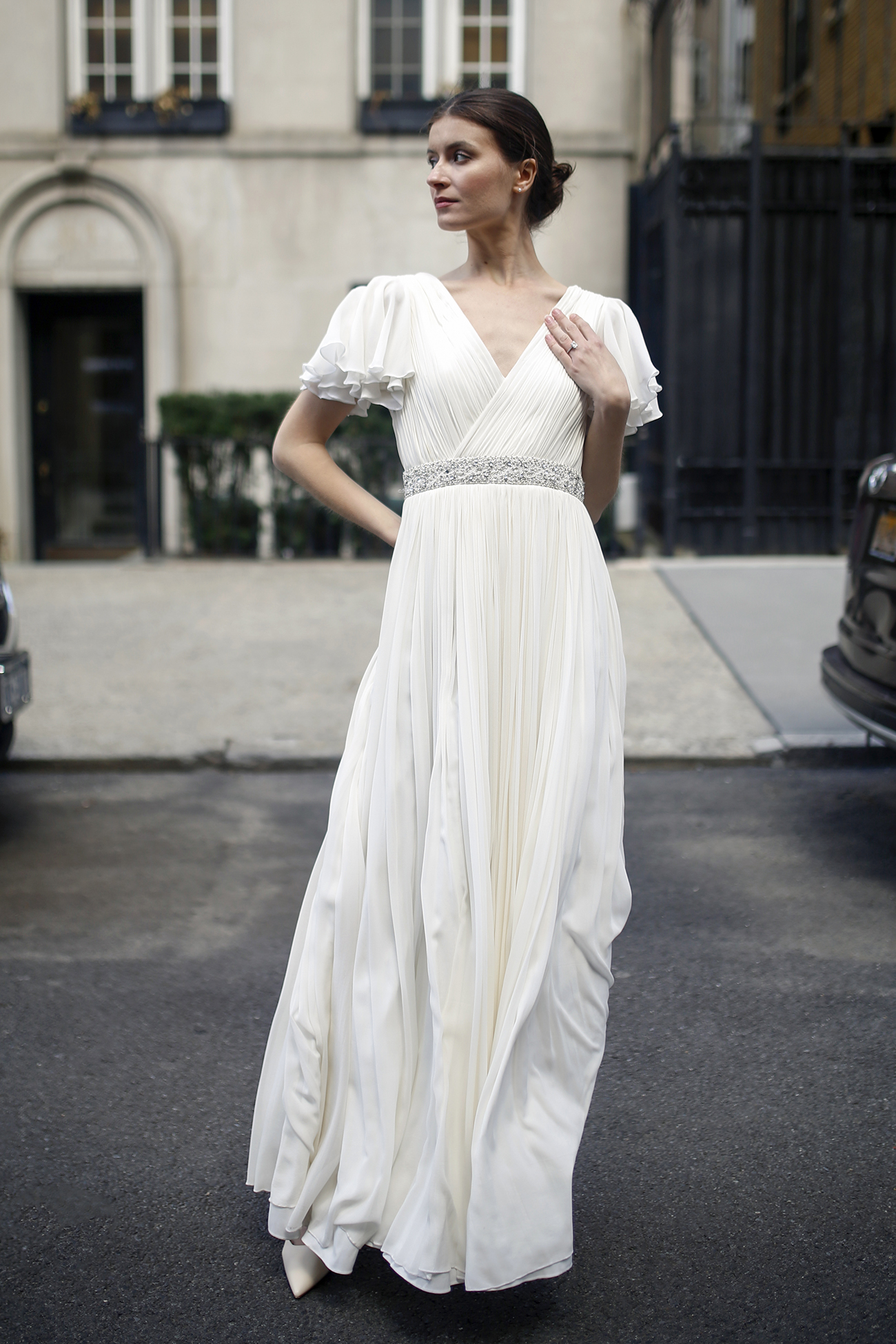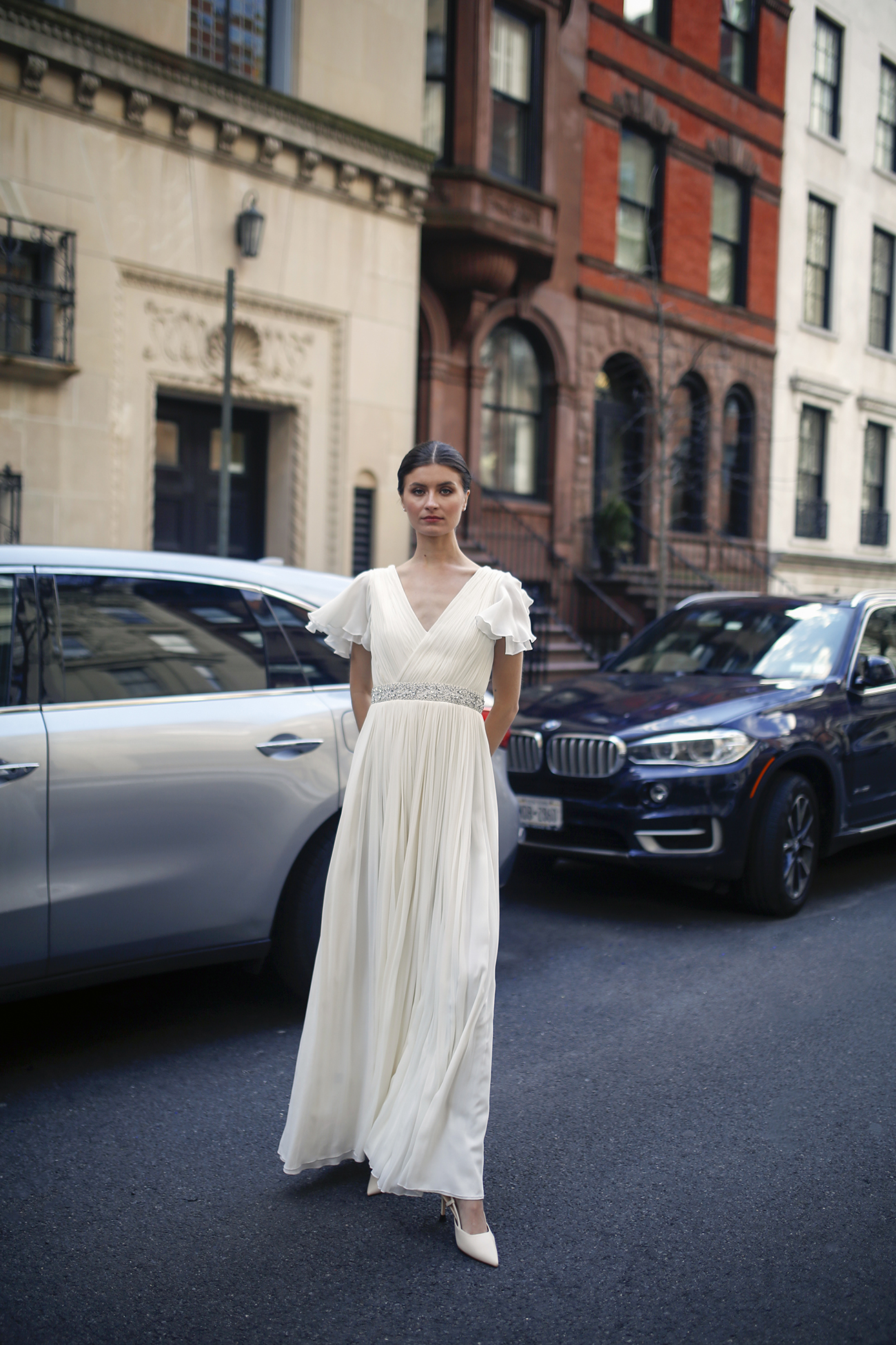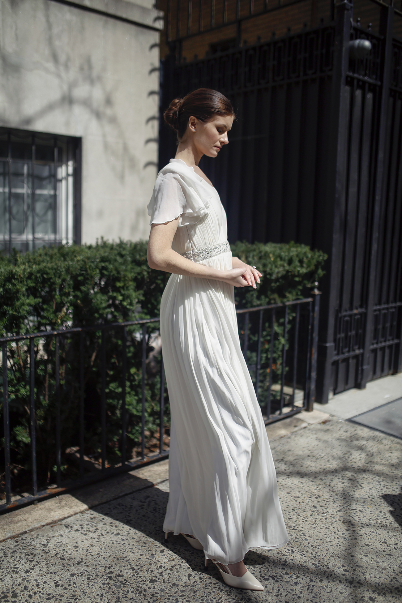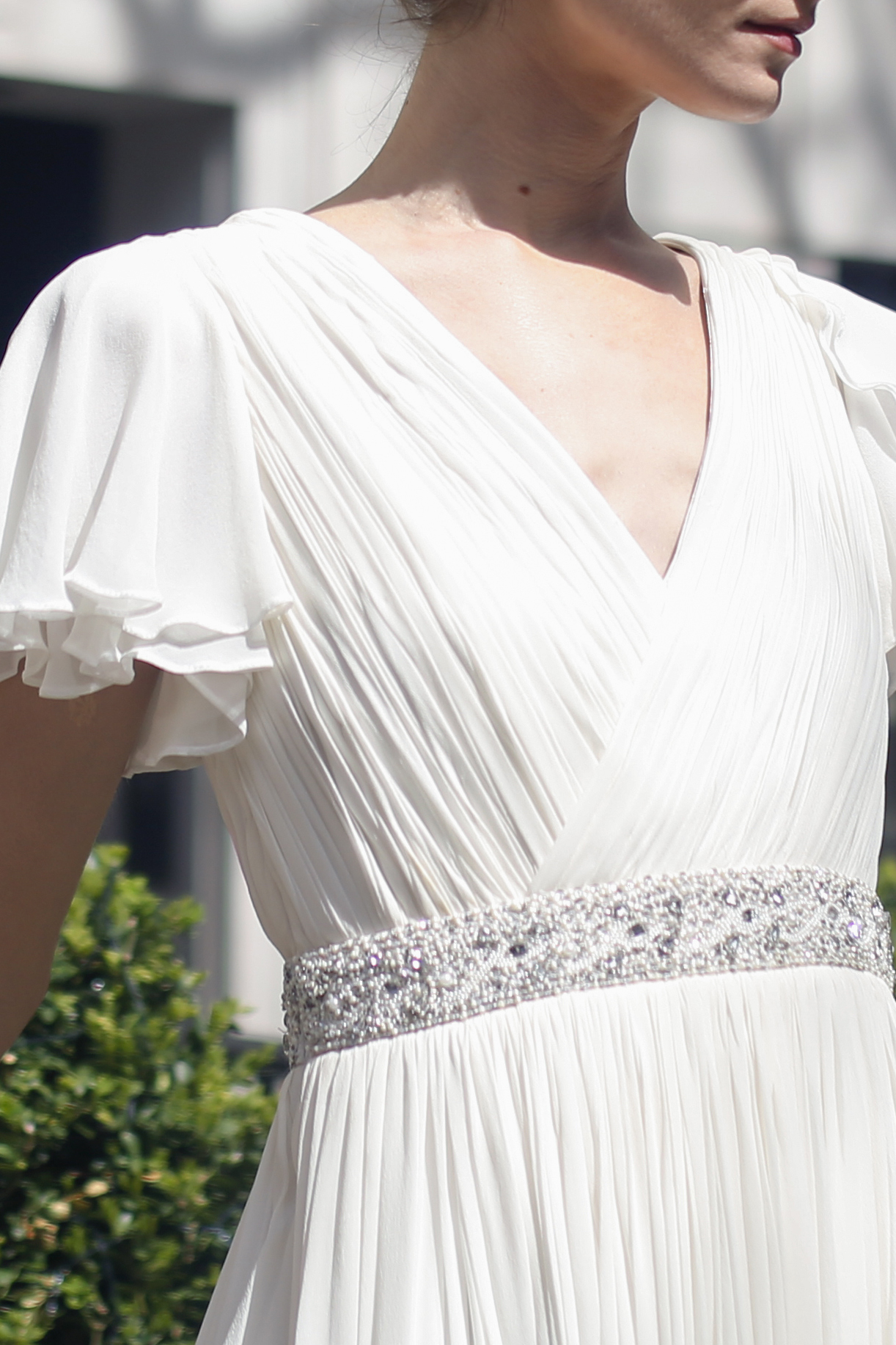 The Eugenie Gown is the embodiment of effortless elegance, designed for the bride who seeks both refinement and ease. Crafted in a fluid silk chiffon, a feminine V-neckline, above waist ruching detail, butterfly sleeves and a jeweled belt, the dress moves effortlessly and exudes a modern yet timeless allure. Delicate flutter sleeves lend movement and a whisper of old world romance. Design summary includes:
