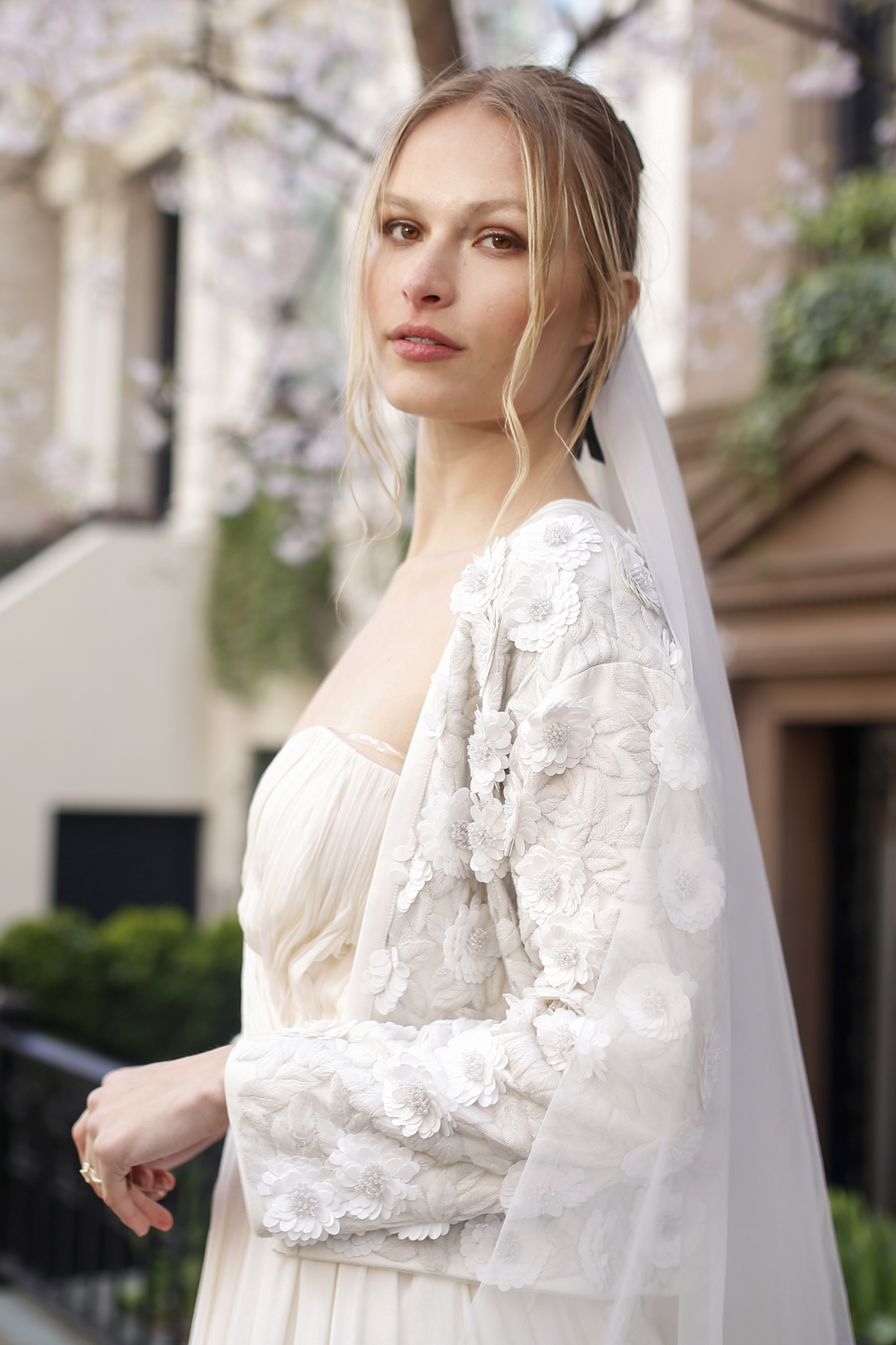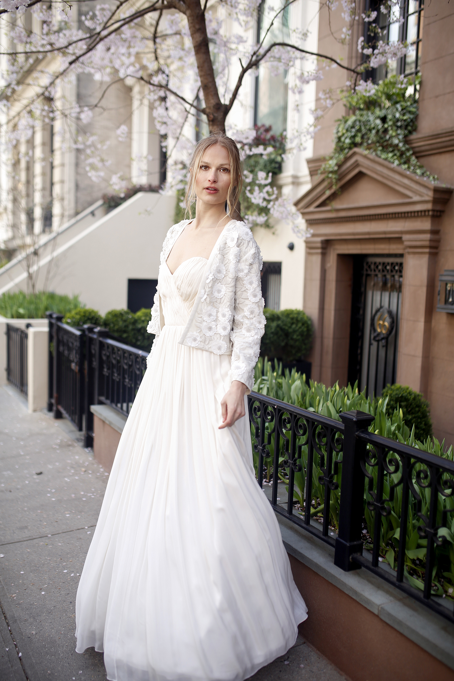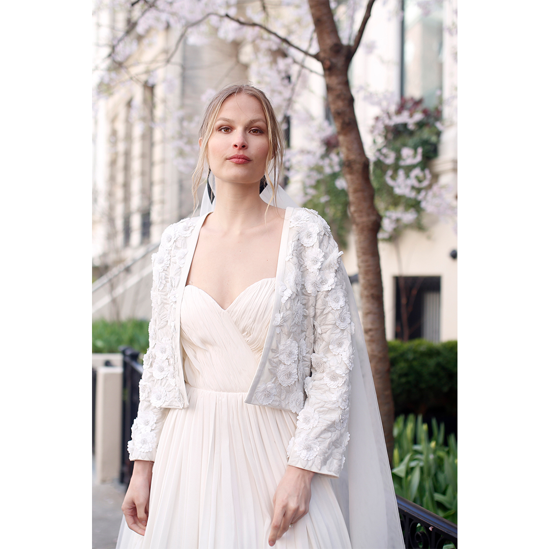 Draped in modern romance, the Hélene Bridal Jacket is exquisitely hand embroidered by skilled artists. The jacket offers an exquisite layer of refinement as a wedding-day ensemble. The cropped silhouette frames the waistline effortlessly, while the open-front design allows the gown beneath to take center stage. Design summary includes: