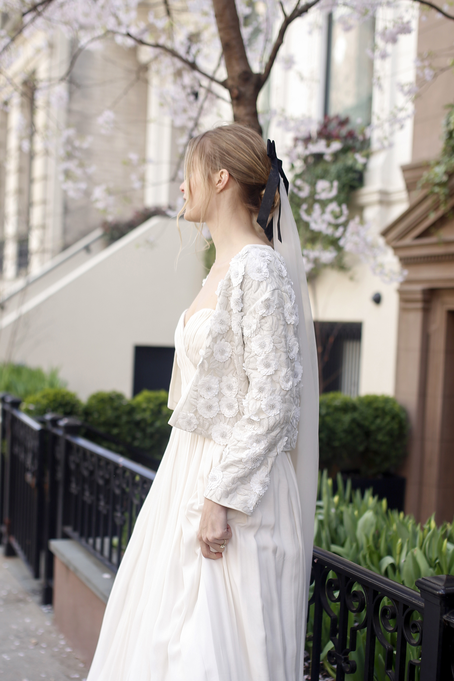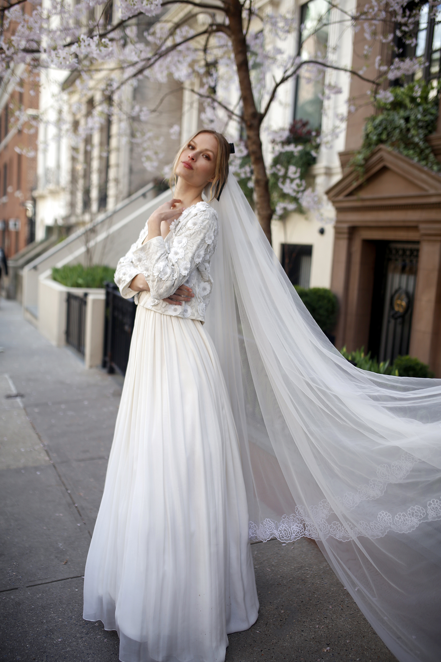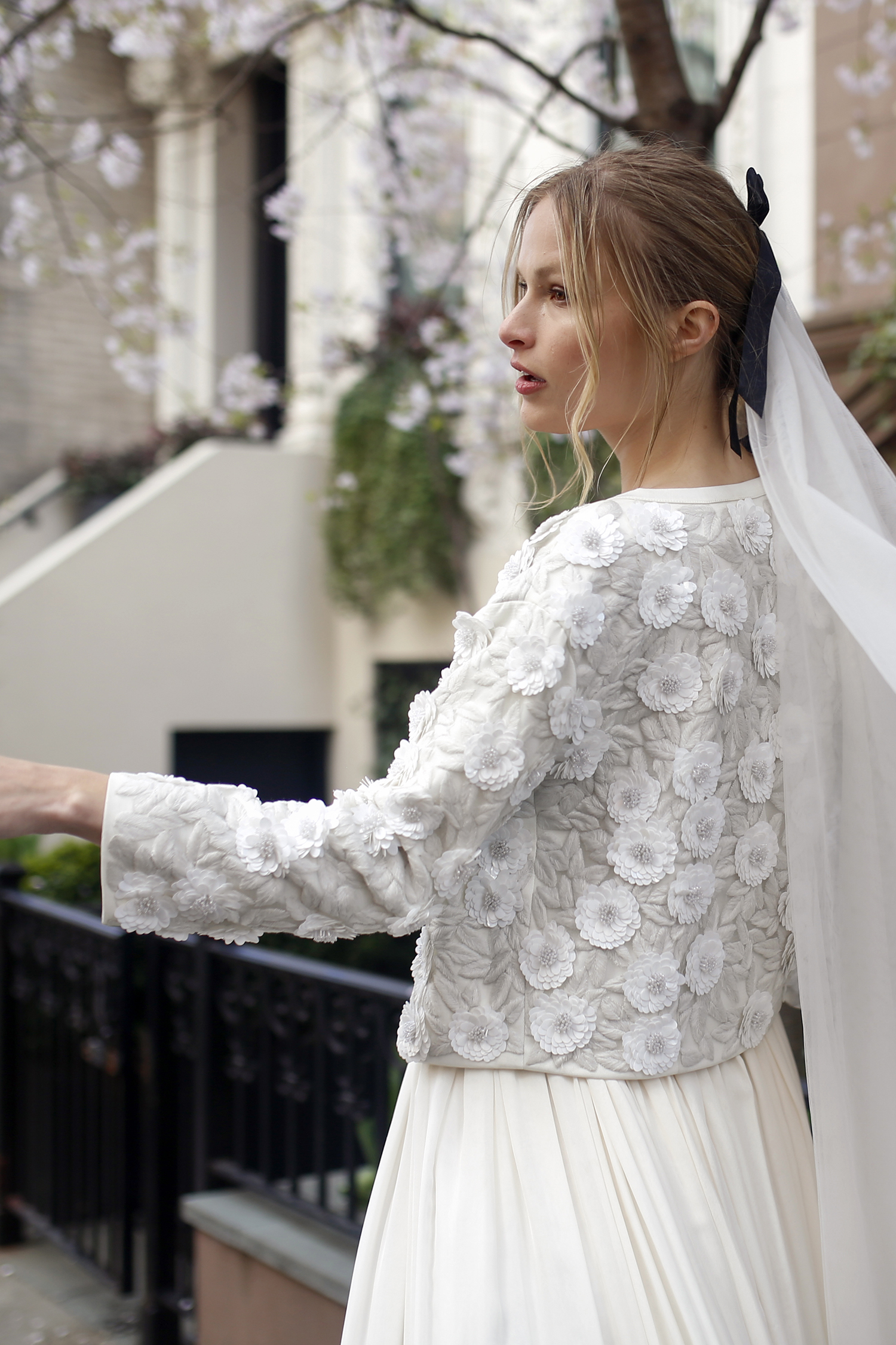 Draped in modern romance, the Hélene Bridal Jacket is exquisitely hand embroidered by skilled artists. The jacket offers an exquisite layer of refinement as a wedding-day ensemble. The cropped silhouette frames the waistline effortlessly, while the open-front design allows the gown beneath to take center stage. Design summary includes: