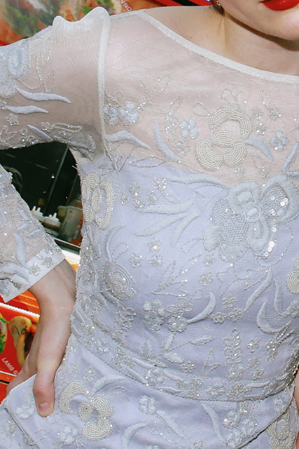 Indulge in the epitome of grace and beauty in our Coralie Dress, a masterpiece of refinement and romance. Designed for the modern sophisticate, this enchanting creation features a delicately sculpted sheer boat neckline and exquisite hand embroidery exuding timeless allure while framing the collarbones with effortless poise. Whisper-soft sheer sleeves ethereal charm, their gossamer fabric lightly brushing against the skin, striking the perfect balance between demure and daring. Notable design features include: