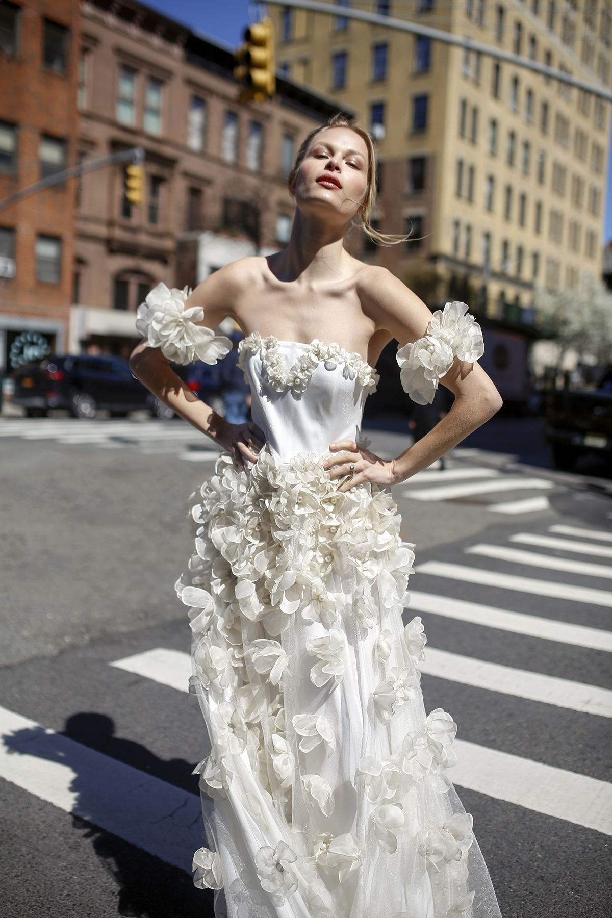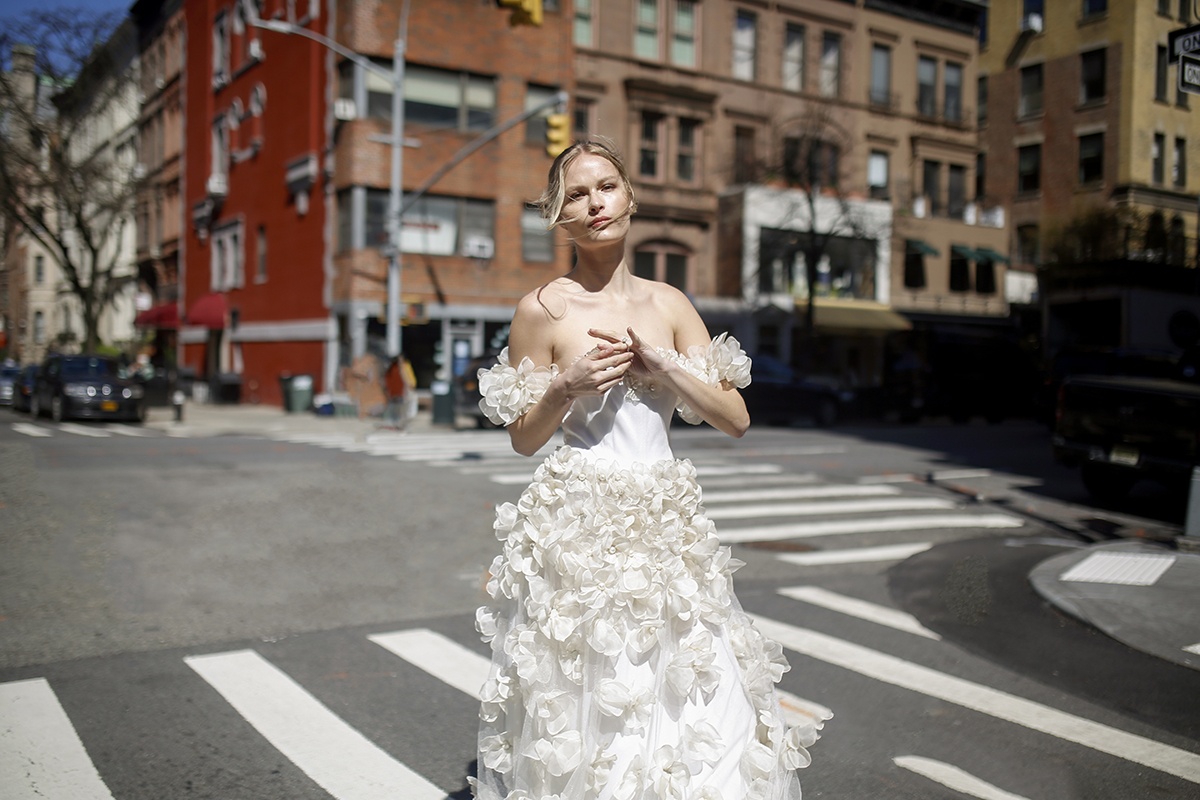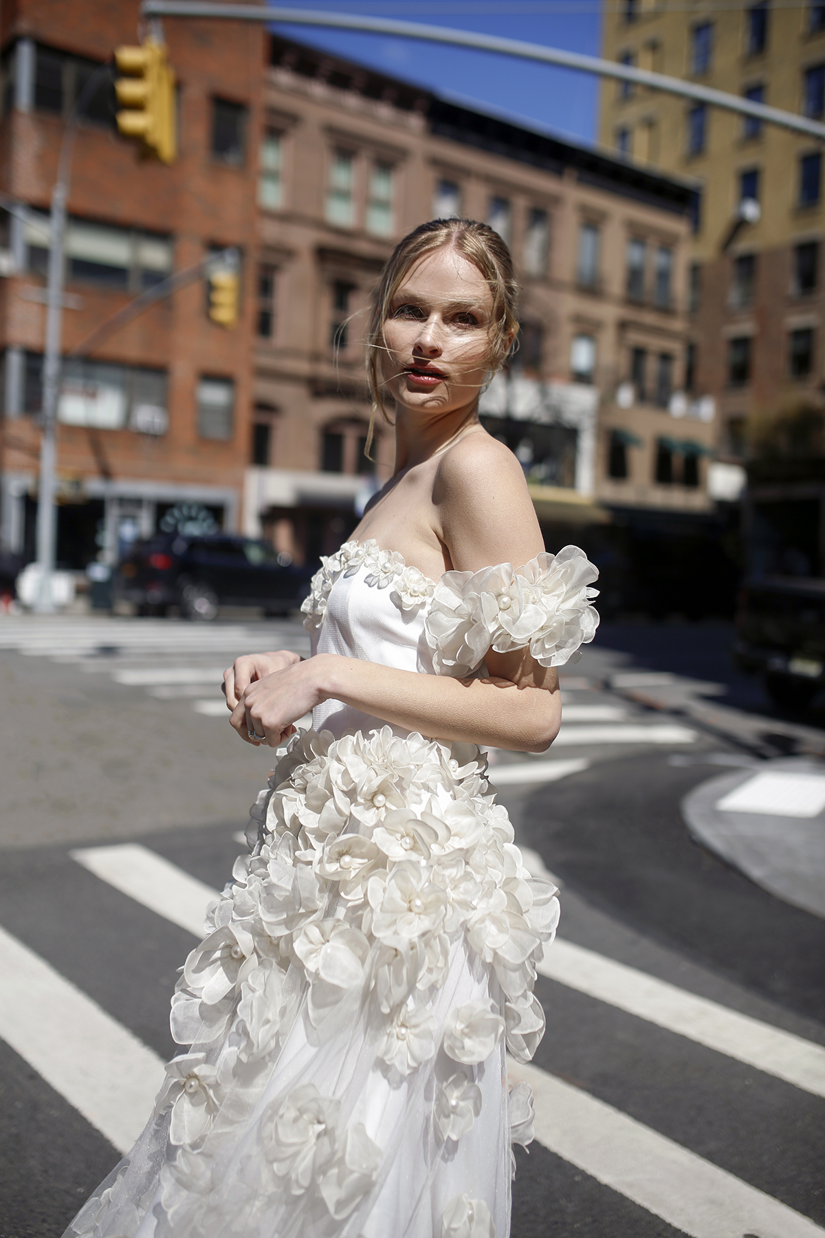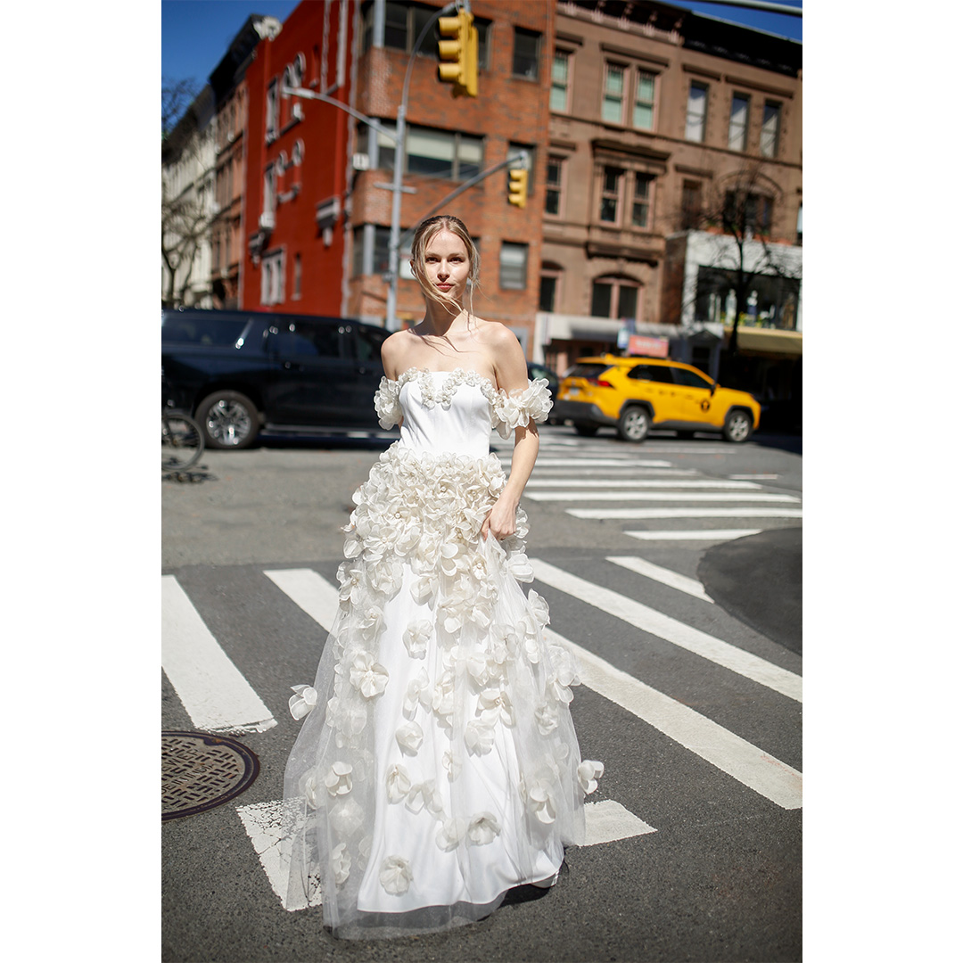 Unfolding like a dream in motion, the Daphne Gown is an exquisite composition of romance, femininity, and modern artistry. Cut from luminous white silk organza and and appliqued with flowers in the same diaphanous fabric, this off- shoulder silhouette is also adorned with a profusion of hand-appliquéd organza petals on the arm. The motifs are delicately sculpted to float like blossoms in a spring breeze. Design elements include: