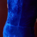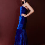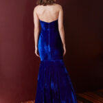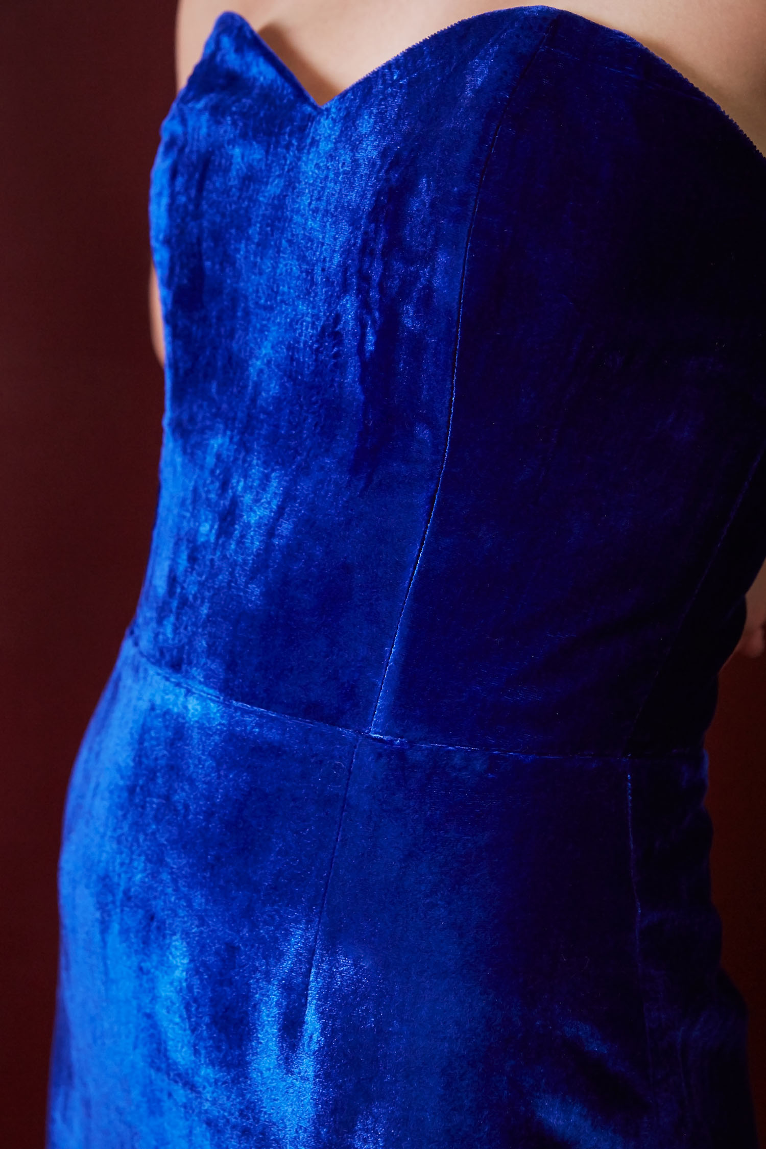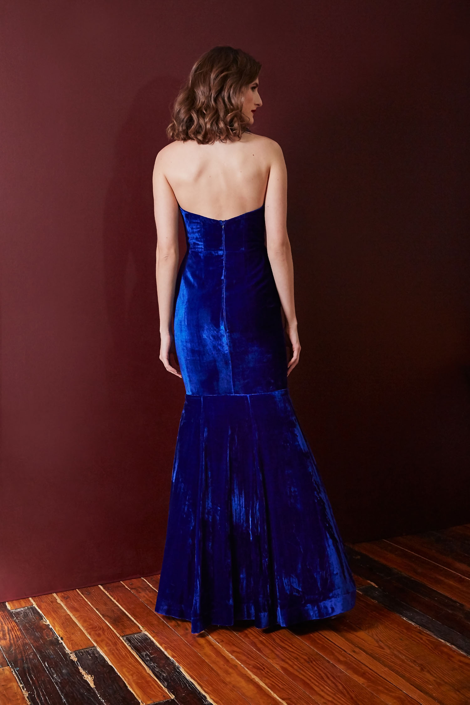 The Eva Gown is an impeccable balance between restrained minimalism and bold effervescence. Cut from silk velvet in a striking royal blue, central design constructs are: