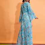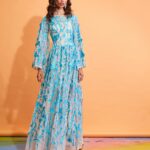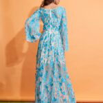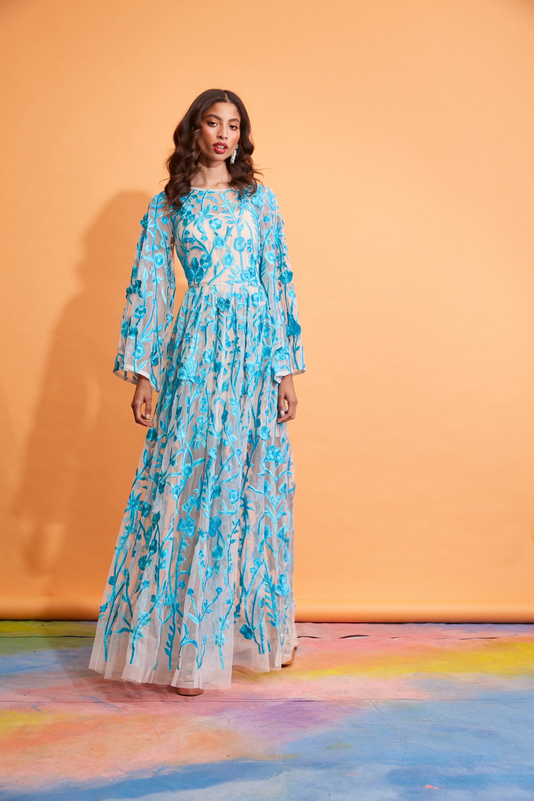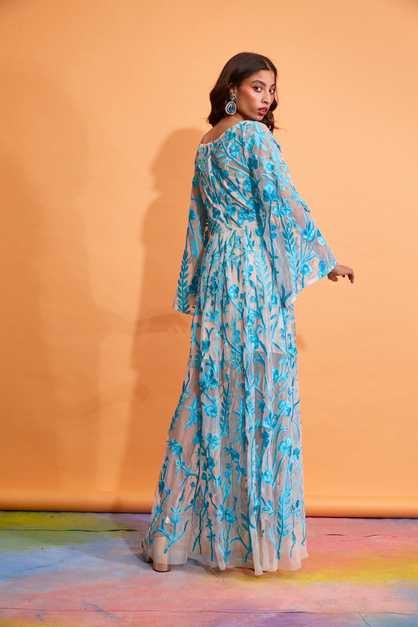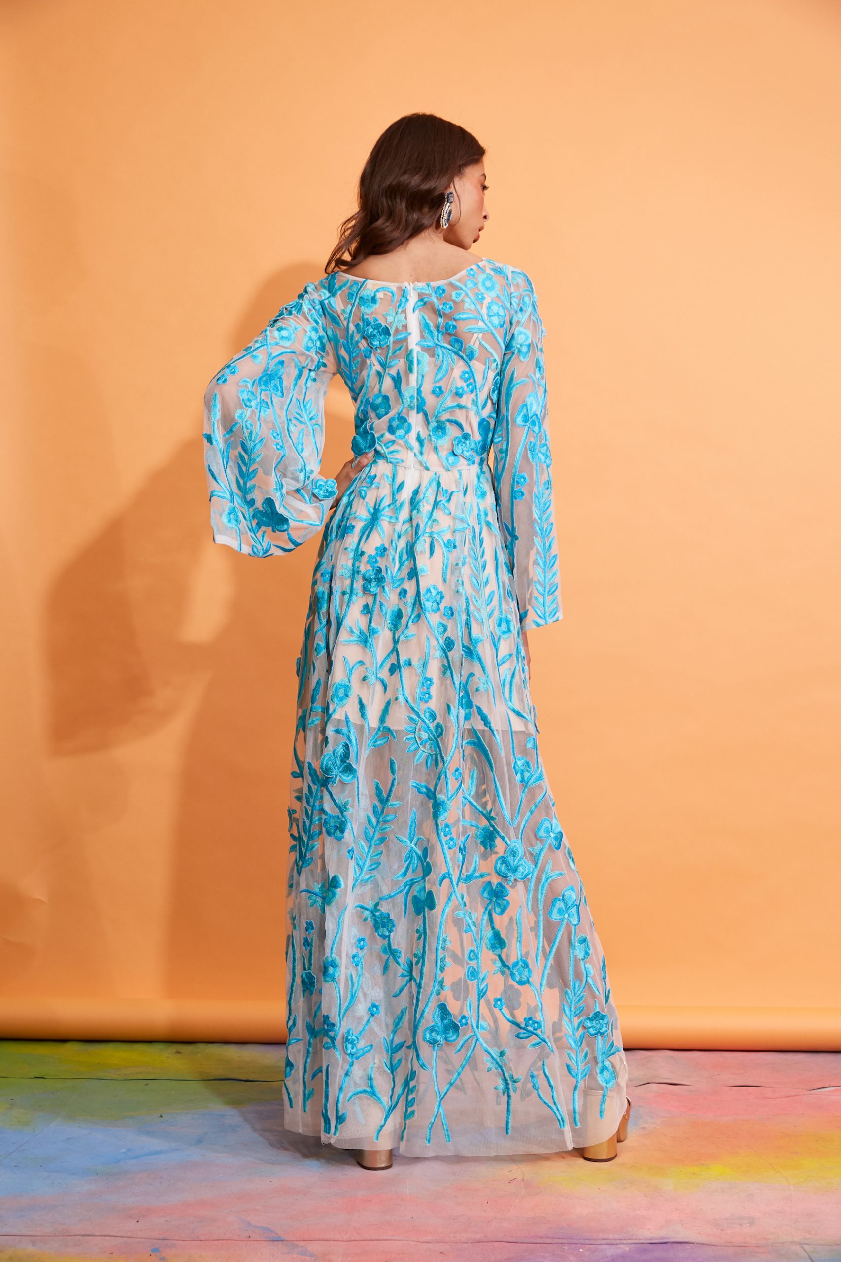 Capturing a spirited essence of bohemia, the tulle Gladys Gown is lavishly embroidered with turquoise floral motifs. Design elements include: