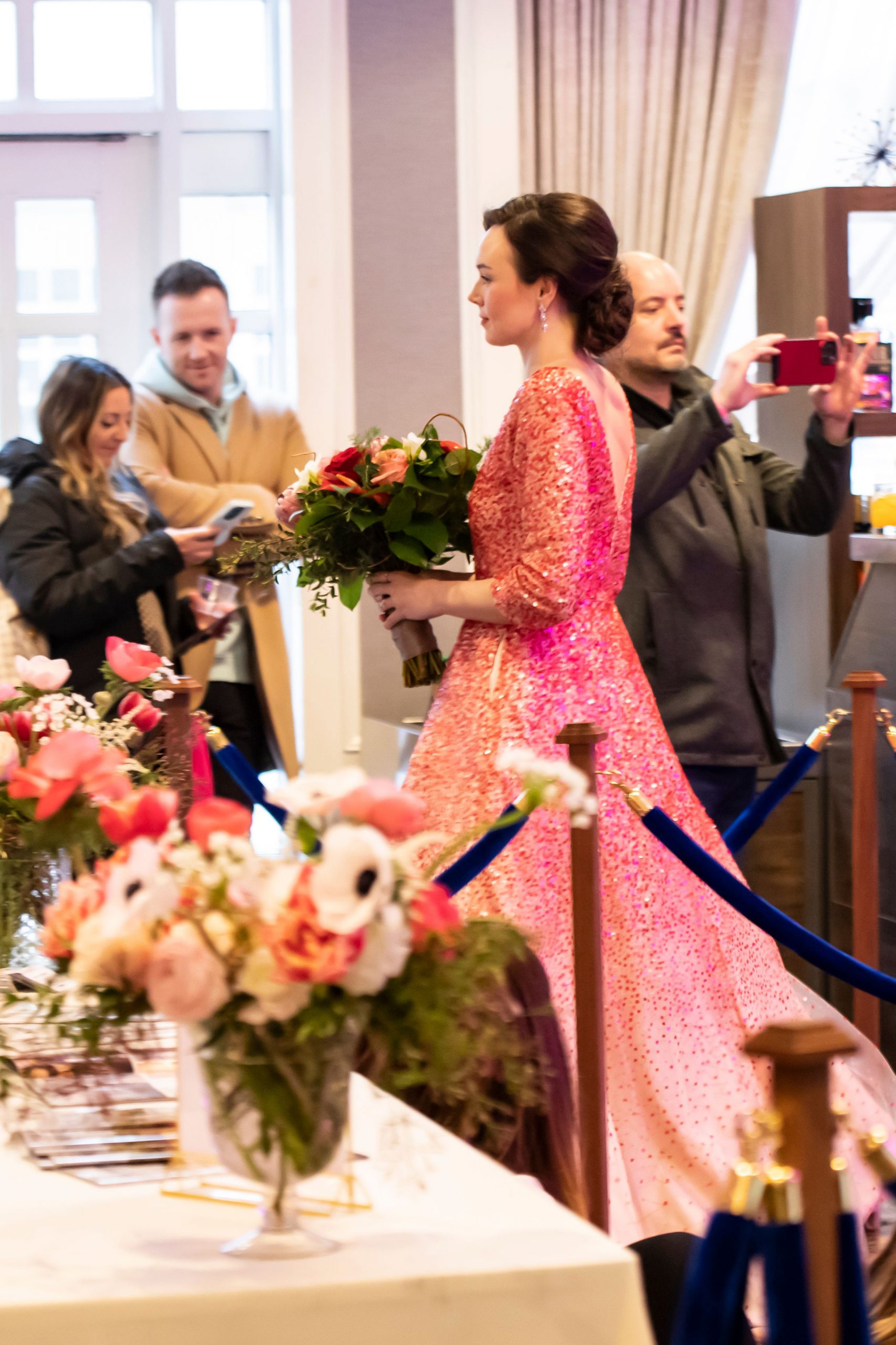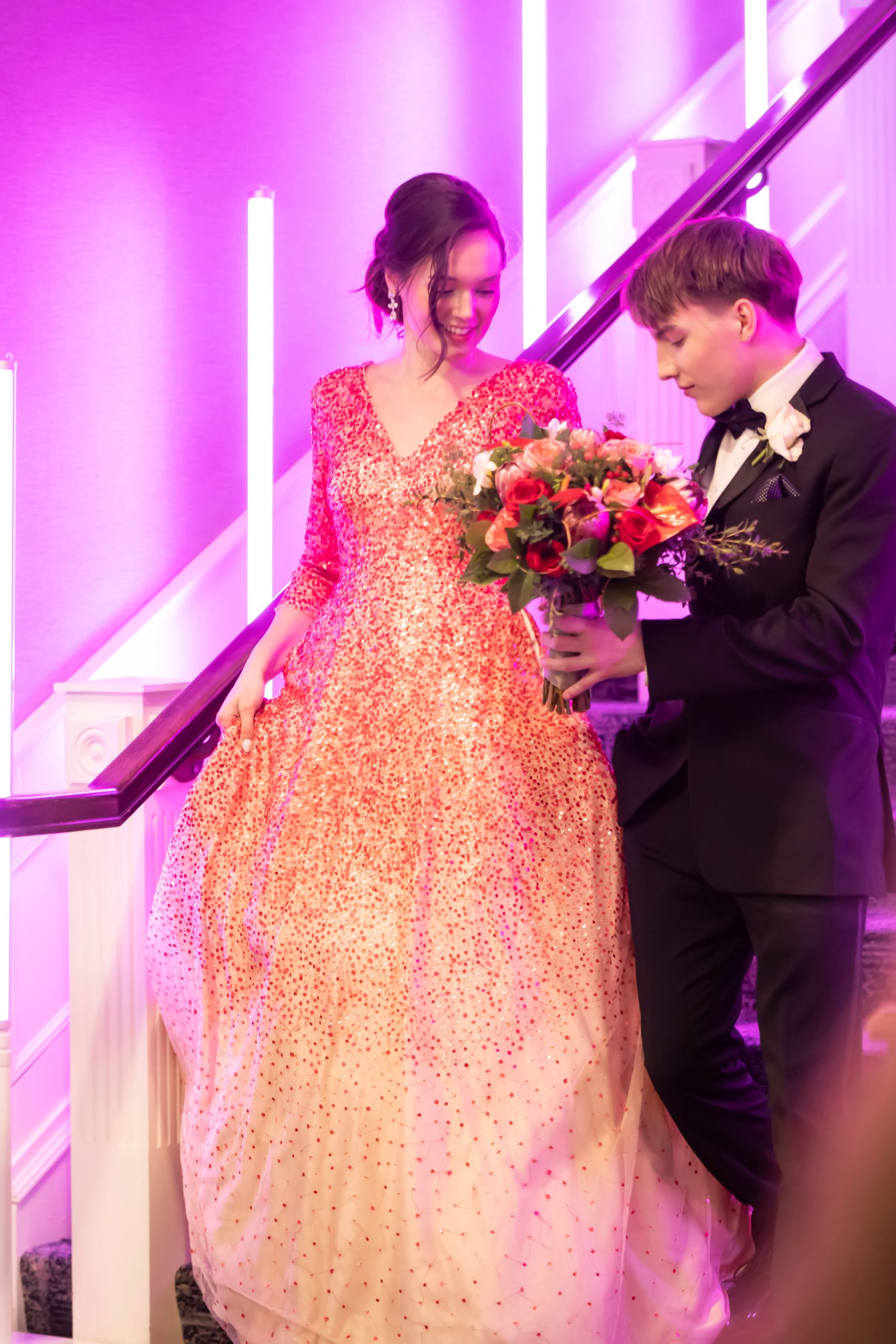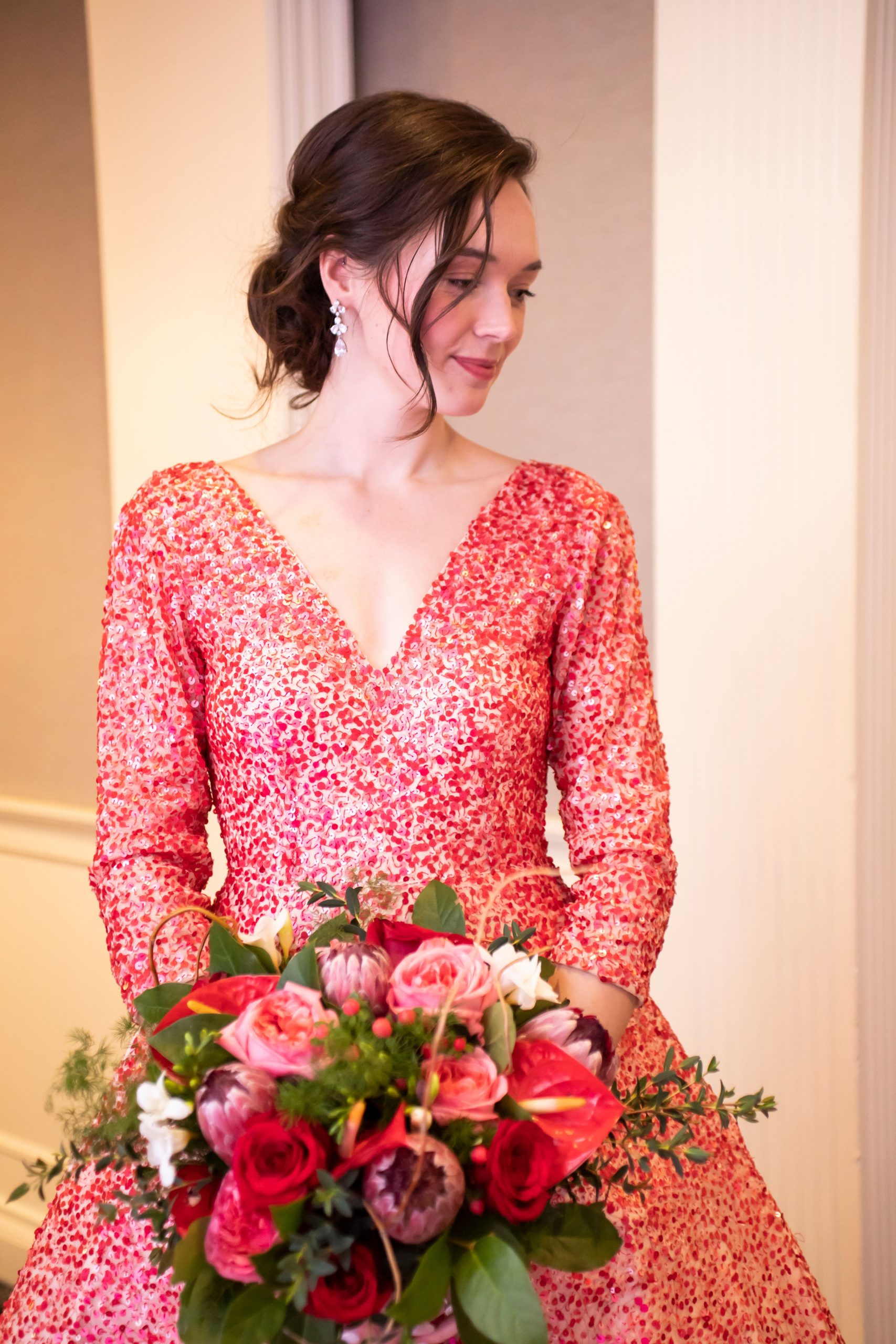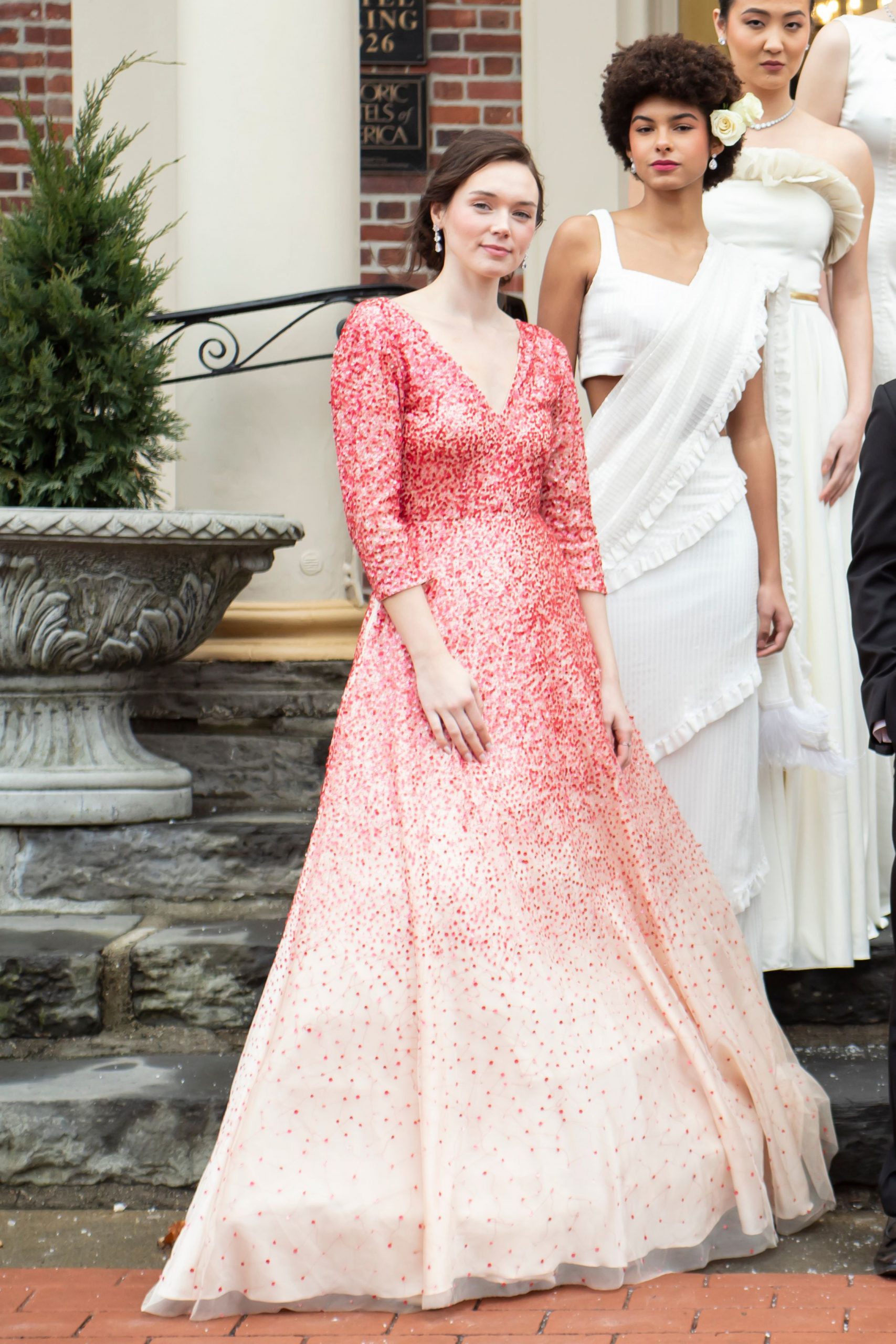 A stand-out ball gown fully hand-embellished in pink and red imported sequins hand-applied in gradient fashion on pale blush tulle. Deep v-neckline, three-quarter sleeves. A dramatic, head-turning floor length skirt.
