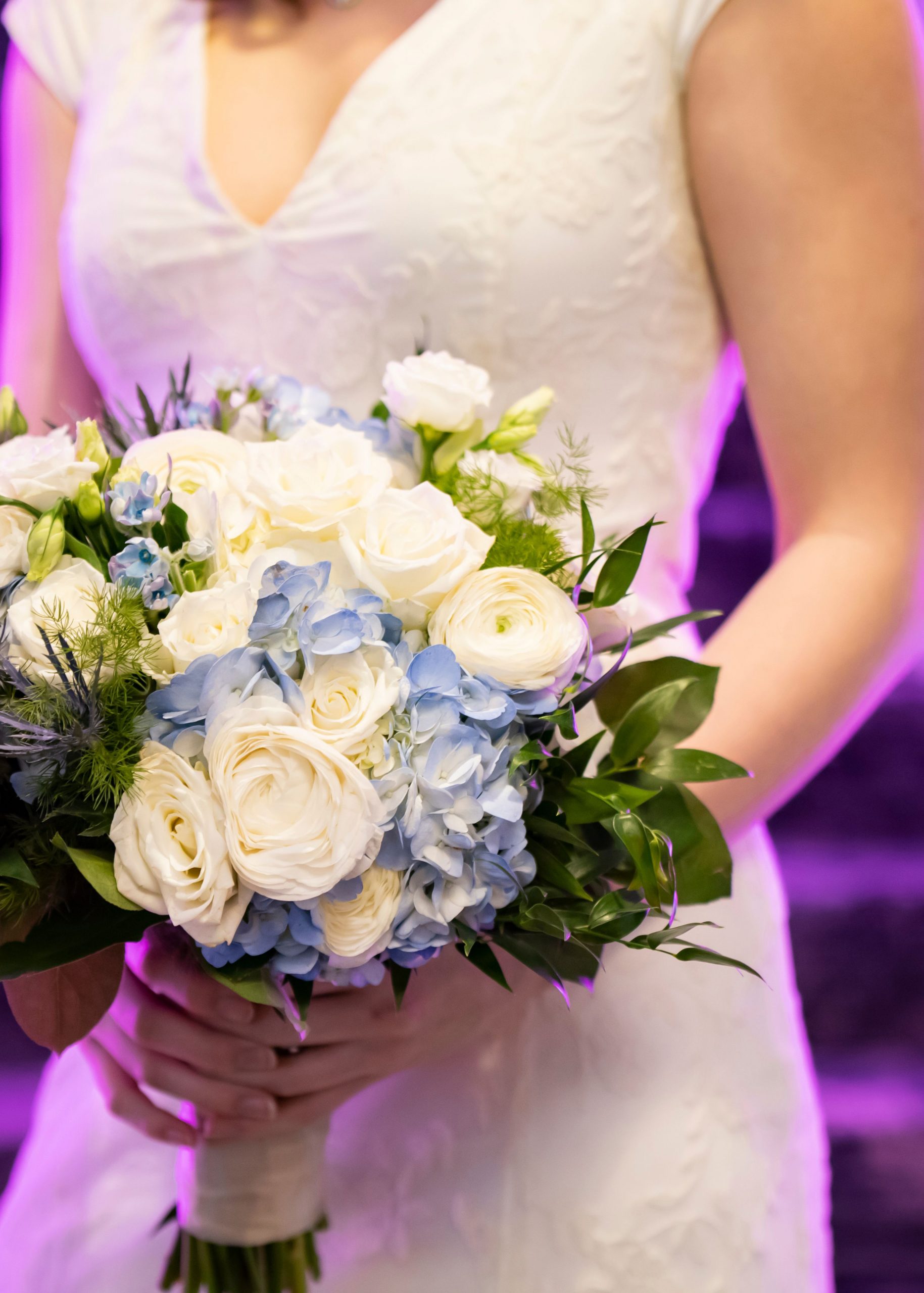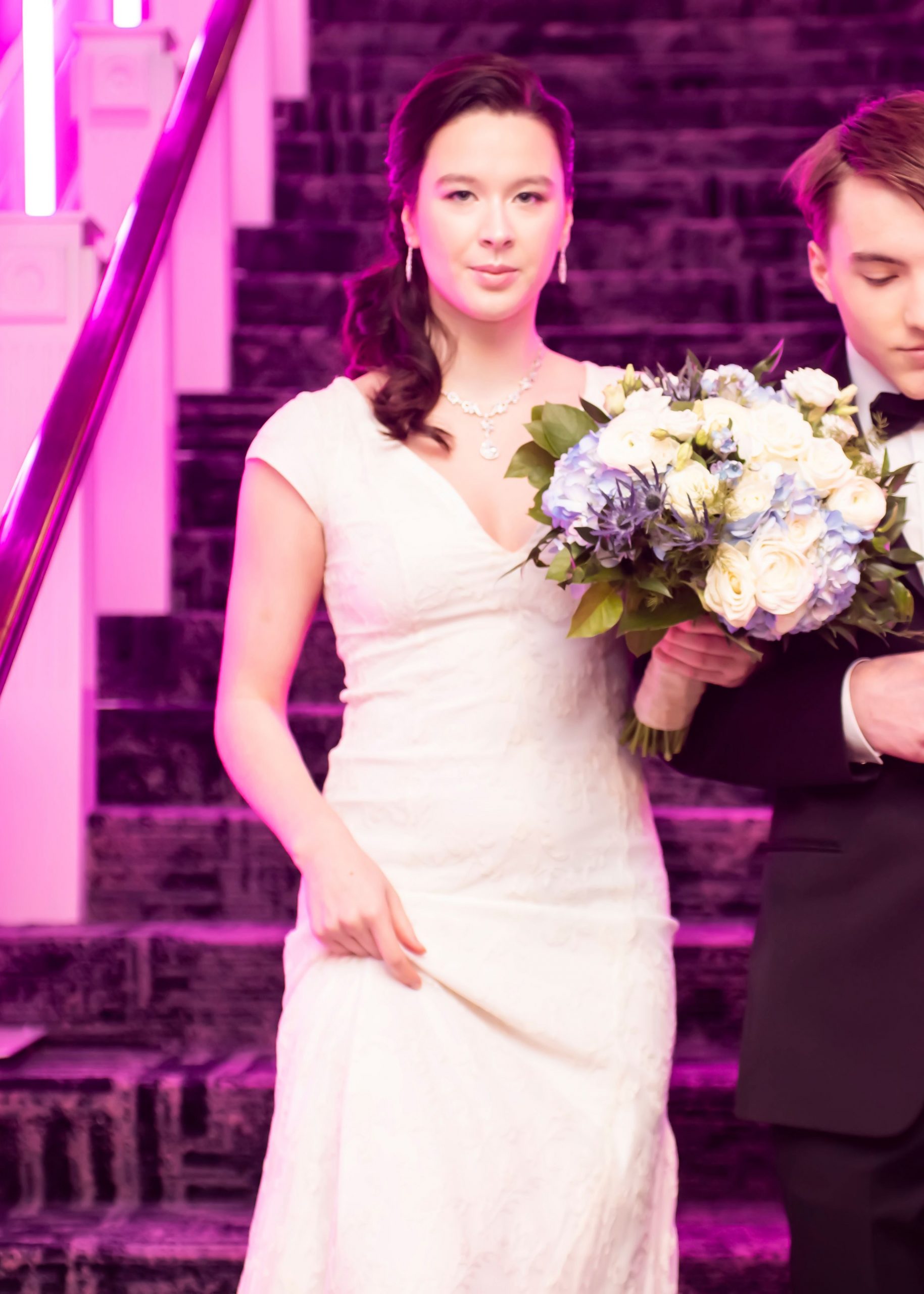 A feminine design gradually flared at the hemline, terminating in a dramatic train. Graceful deep v-neckline and classic capped sleeves. Floor-length, created with fabric adorned with floral embroidery throughout.