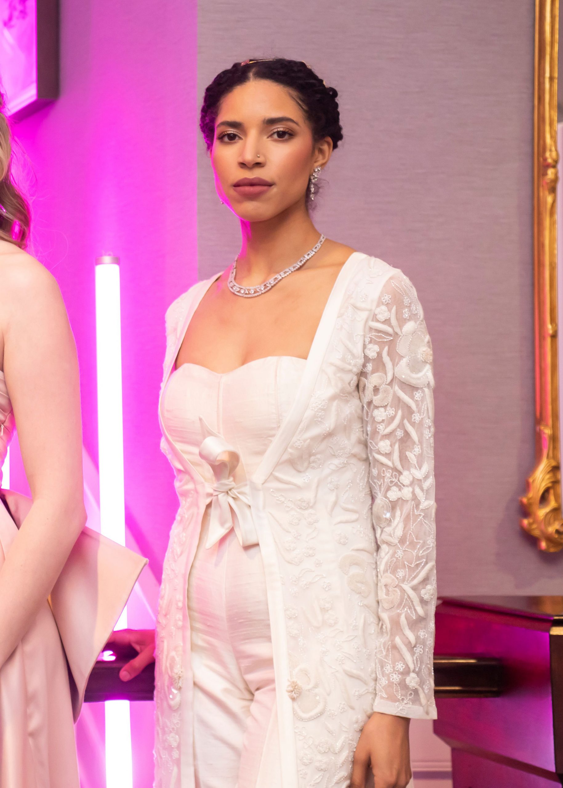 A silk strapless  jumpsuit with a heart- shaped neckline for a contemporary and timeless bridal look.