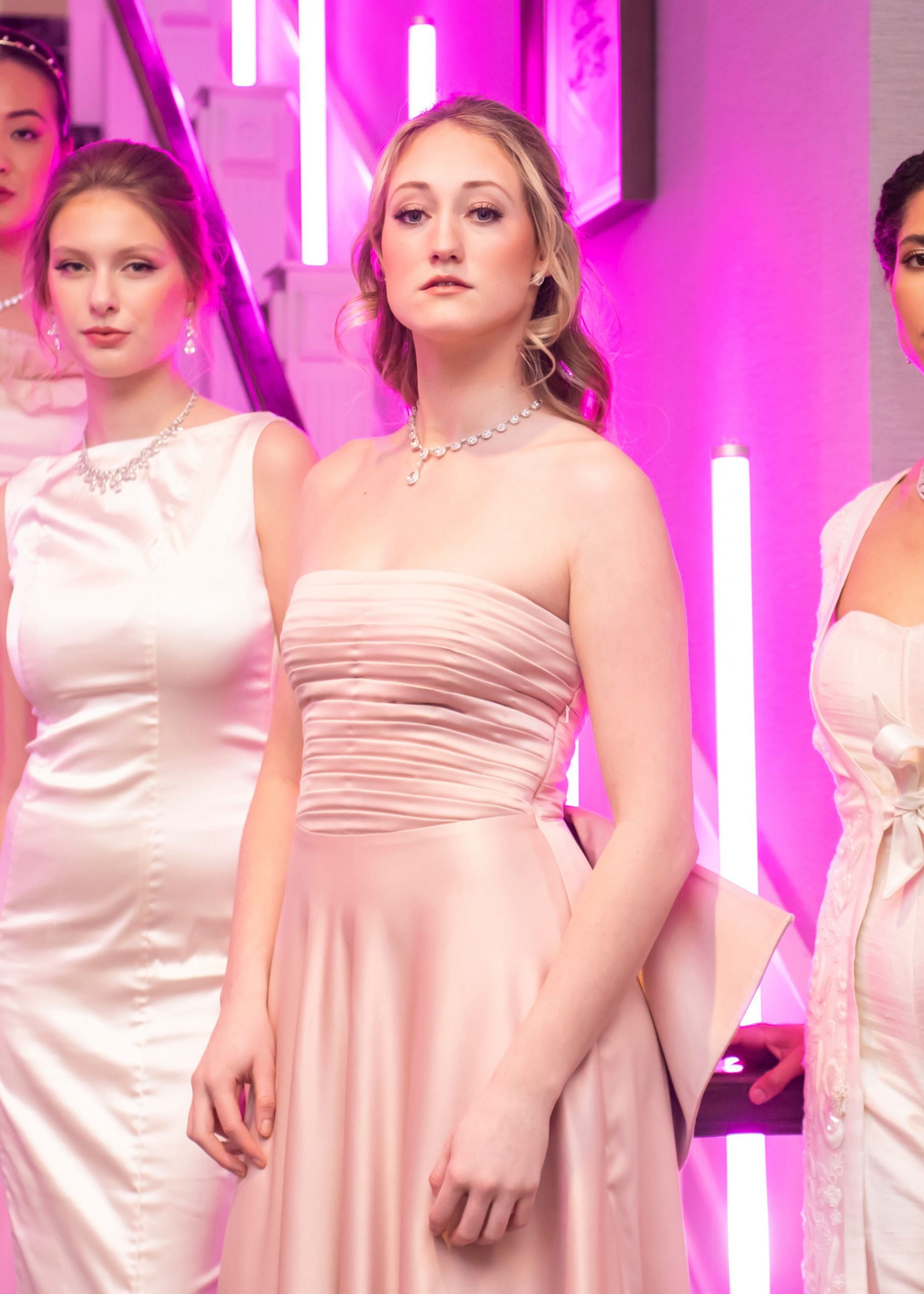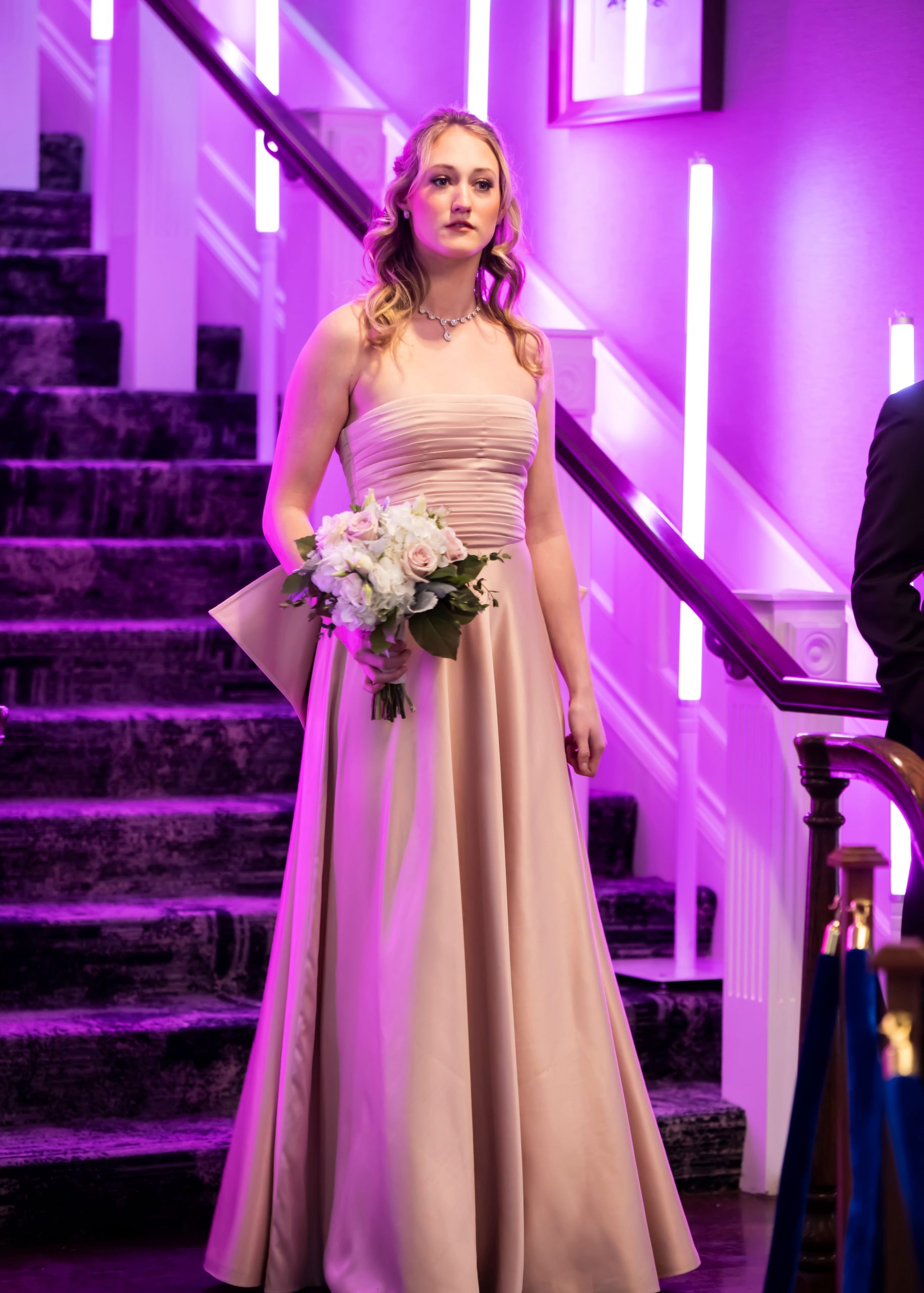A clean and classic bias cut silhouette in blush duchess satin. Strapless with delicately ruched fitted bodice. Feminine design with exaggerated statement ribbon detail in back.