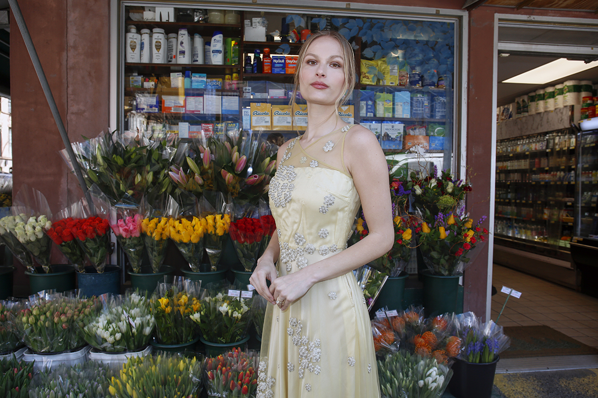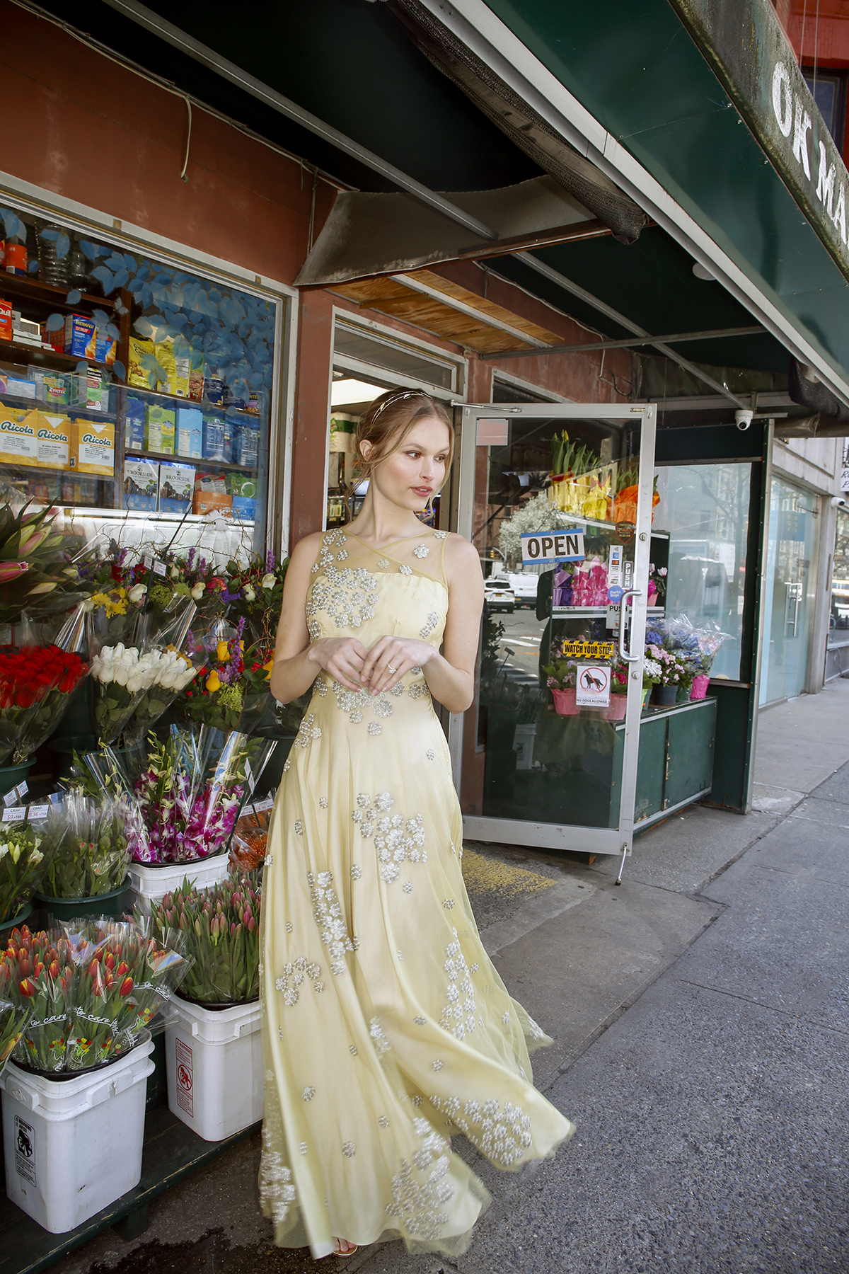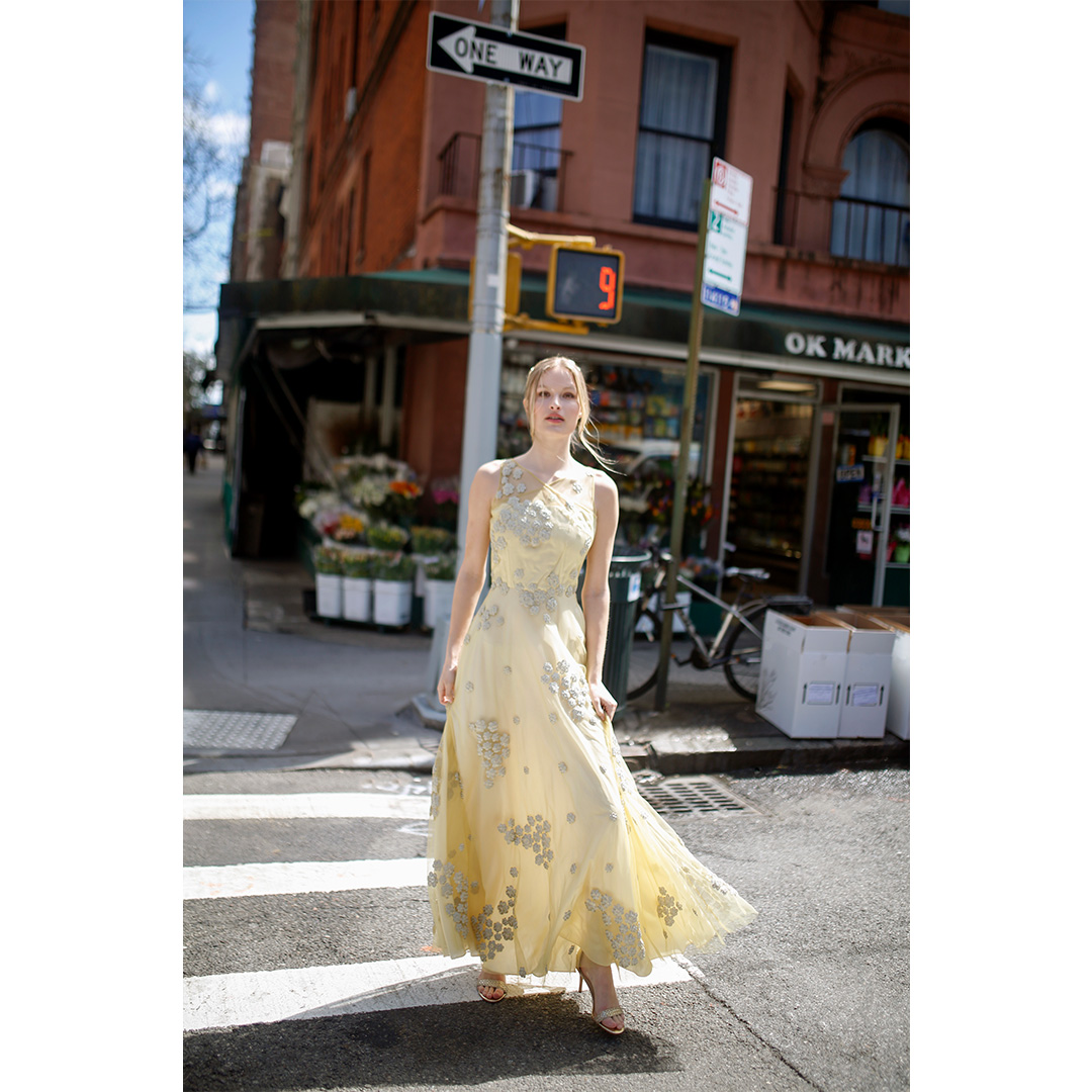 A poetic ode to springtime elegance, the Solana Gown evokes a dreamlike femininity with every step. Bunches of hand embroidered silver flowers are delicately scattered on pale gold tulle defining a care- free, bohemian vibe to this look. This floor-length gown floats effortlessly and playfully offering both weightlessness and refinement. Design elements include: