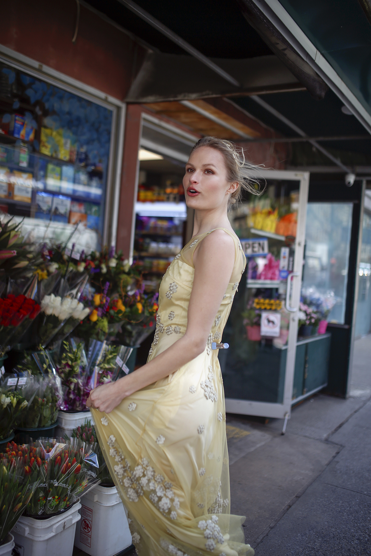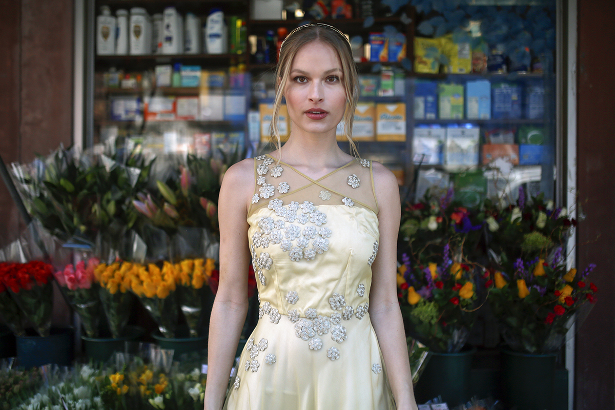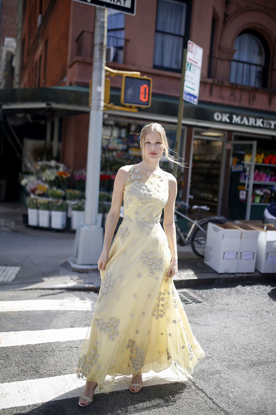 A poetic ode to springtime elegance, the Solana Gown evokes a dreamlike femininity with every step. Bunches of hand embroidered silver flowers are delicately scattered on pale gold tulle defining a care- free, bohemian vibe to this look. This floor-length gown floats effortlessly and playfully offering both weightlessness and refinement. Design elements include: