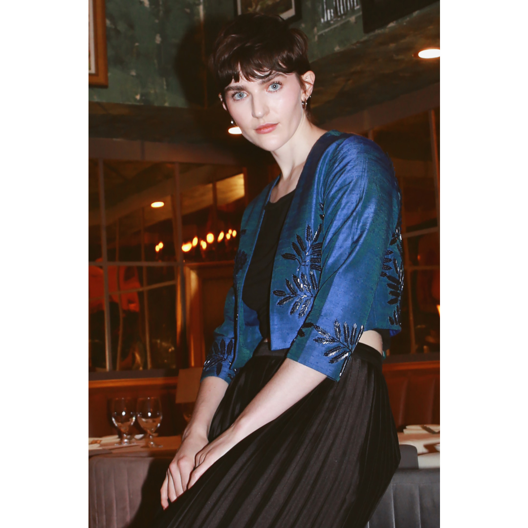 Wrap yourself in ultra- luxury and sophistication with the Victorine Jacket, a timeless statement piece that spells exquisite detailing, grace and allure. Designed to complement your spring wardrobe with effortless refinement, this bolero-style jacket has hand embroidered feathers appliqued on eagle motifs across the back and front. The silhouette is tailored to perfection, offering a structured yet lightweight layer of luxury. The sapphire blue shade in rich hand woven silk sets the stage for exquisite hand-applied embellishments, creating intricate couture-level depth and recapture of a time gone by and a forever staple in your wardrobe. Notable design elements include: